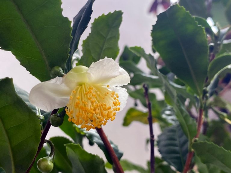 Die Teekamelien haben auf unserem Berner Stadtbalkon jedenfalls einen Ehrenplatz bekommen (und grosse Kübel mit bester Rhododendronerde…) Manche Sorten von Camelia sinensis blühen übrigens recht üppig. Und zwar bilden sie ihre Blüten gegen Ende August und vor allem im September, teilweise sogar bis in den Winter hinein. An meinen Sträuchern stehen dutzende von Knospen und lassen uns gespannt auf ihr Blütenwunder warten. Aber lustigerweise geht immer an jedem Strauch immer nur eine Blüte auf einmal auf. Ich sammle sie, um einen feinen Blütentee damit aufzubrühen. Die Blüten bilden sich vor allem am einjährigen Holz, weshalb die Teesträucher im Frühling komplett zurückgeschnitten werden sollten. Das wird noch etwas Mut erfordern, denn Kamelien schneidet man ja normalerweise nicht, und der Gedanke geht mir grad noch etwas gegen den Strich. Anderseits bin ich wirklich sehr angetan von dem Blütentee und hätte natürlich gerne mehr davon! Der Teeblütentee hat einen ähnlichen Geschmack wie der Grüntee aus den Kamelien-Blättern. Dazu kommt eine erfrischende Säure, die den Tee auch kalt zu einem erfrischenden Getränk macht. Wenn man den Blütentee über Nacht stehen lässt, taucht sogar ein Hauch von Schwarzteearoma auf. Das ist jetzt wirklich die interessanteste und überraschungsreichste Pflanze, die mir seit langem begegnet ist!