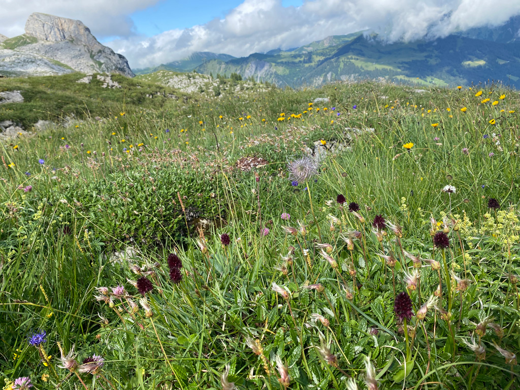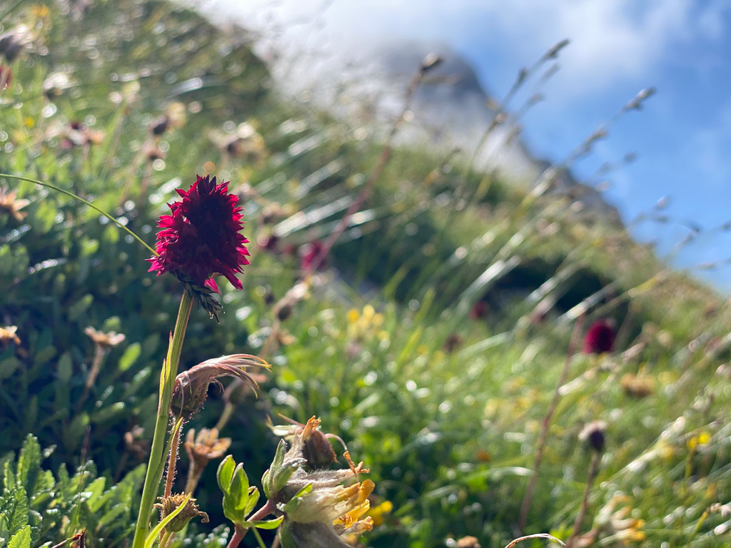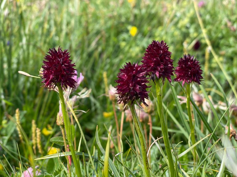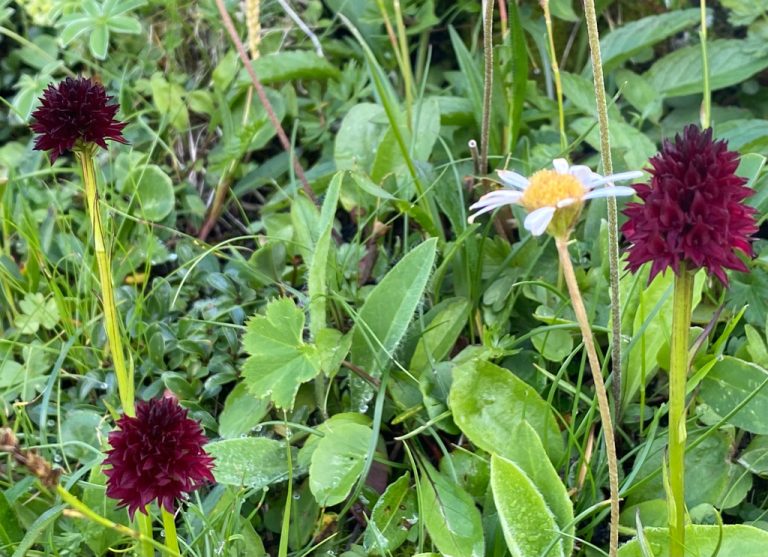 Die kleinen dunkelroten bis fast schwarzen Kugelblüten des Männertreus mochte ich schon als Kind – ihr Duft nach Vanille und Schokolade ist so faszinierend, dass ich mich noch heute niederknie, wenn ich ein Männertreu finde, und daran schnuppere. Es gibt eine schwarze und eine rote Sorte dieser kleinen Orchidee (Nigritella nigra bzw. rubra). Bei uns im Westen der Alpen ist das schwarze Männertreu vorherrschend. Die rote Form findet sich eher Richtung Graubünden. Man findet das Männertreu praktisch auf jeder Bergwanderung oberhalb der Baumgrenze, wo es auf mageren Kalkrasen zusammen mit anderen Alpenblumen gedeiht. Da es so häufig vorkommt, hat es im Volksmund auch viele Namen, wie beispielsweise Brändli, Nasenblutenblume oder Kohlröschen. Der gebräuchliche Name hat übrigens nichts mit treuen Männern zu tun. Vielmehr bedeutet er „den schwachen Männern treu“, weil das Pflänzchen früher als Aphrodisiakum Verwendung fand. Auch gab es den Brauch, der Angebeteten drei Blüten des Männertreus unter dem Kopfkissen zu verstecken, um so ihre Gunst zu gewinnen.