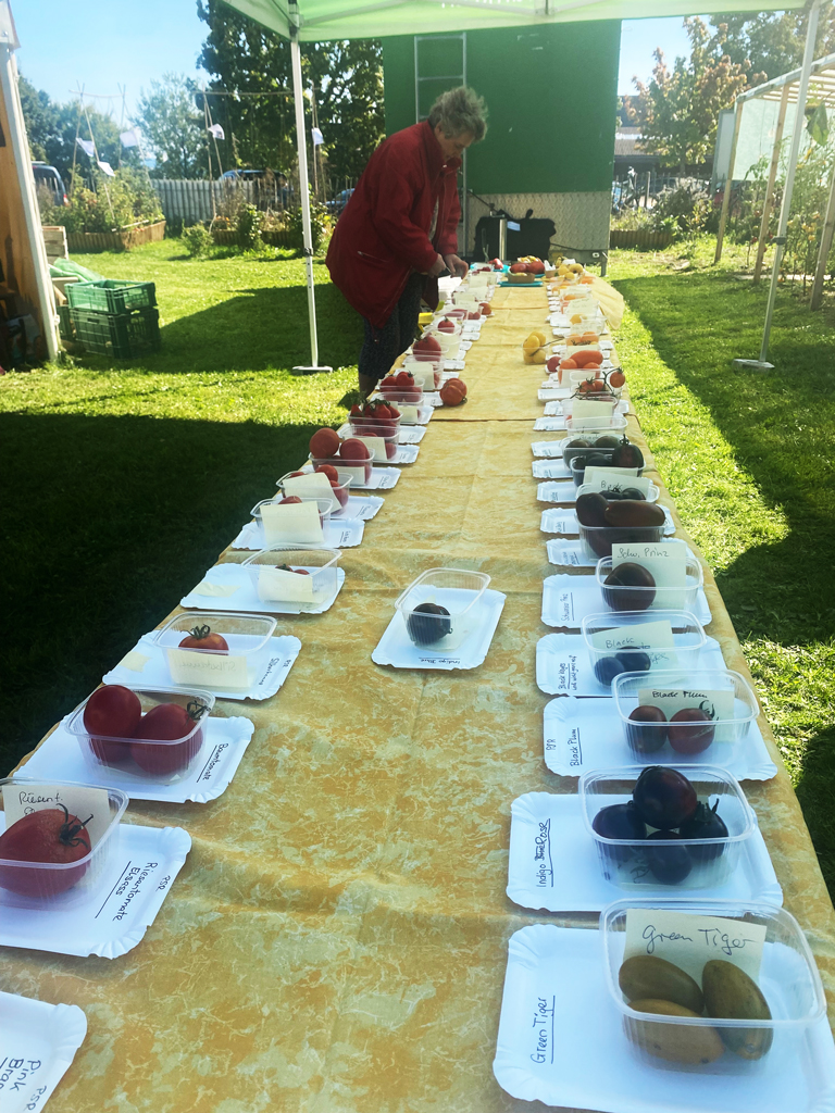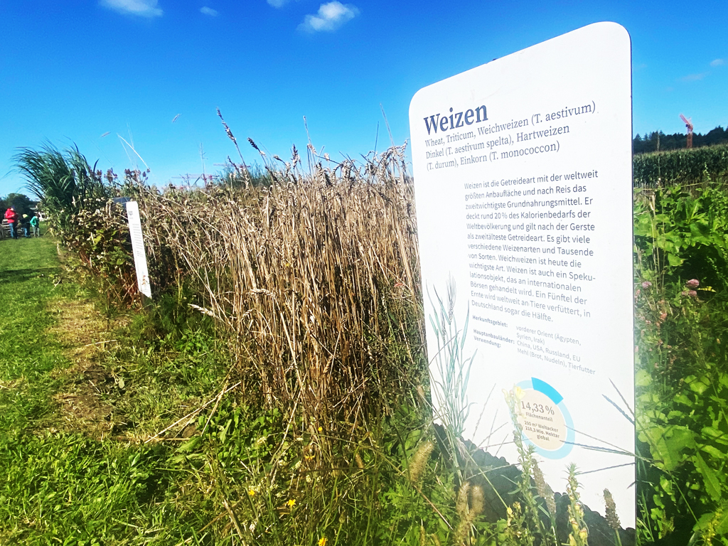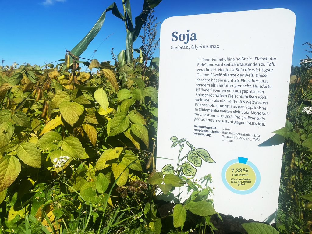 Vor allem aber wird einem bewusst, was wie viel Platz braucht. Dabei schneiden Gemüse, Nüsse und Kartoffeln recht gut ab. Was aber sofort auffällt, ist die riesige Fläche mit Soja, das weltweit für Tierfutter angebaut wird. Die Sojabohnen vom Weltacker werden in Bern lokal zu feinem Tofu verarbeitet. Das schmeckt gut, ist gesund, und vor allem sinnvoll: Mit Tofu kann man pro Fläche sehr viel mehr Menschen ernähren als mit Tiermast. Auch der Anbau von Baumwolle braucht wahnsinnig viel Platz. Diese und viele weitere Einsichten gewinnen die Besucherinnen und Besucher vor Ort in Zollikofen. Der Weltacker ist ein Lehrblätz in Sachen Nachhaltigkeit. Die 2000 Quadratmeter sind zustande gekommen durch eine einfache Rechnung: Die global verfügbare Ackerfläche wird durch die Zahl der Erdenbürger/innen geteilt. Auf dieser Fläche sollte alles wachsen, was einen Menschen ernährt und versorgt. Die Schweizer/innen brauchen für ihren Lebensstandard im Durchschnitt etwa sieben Mal so viel Platz, wie auf der Welt vorhanden ist.