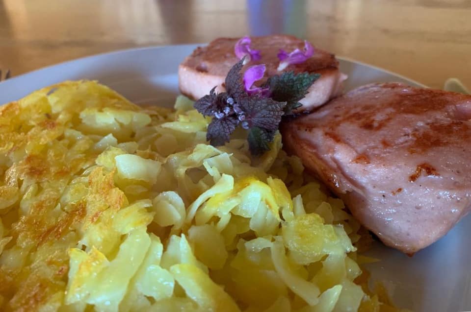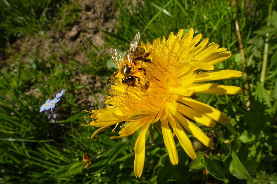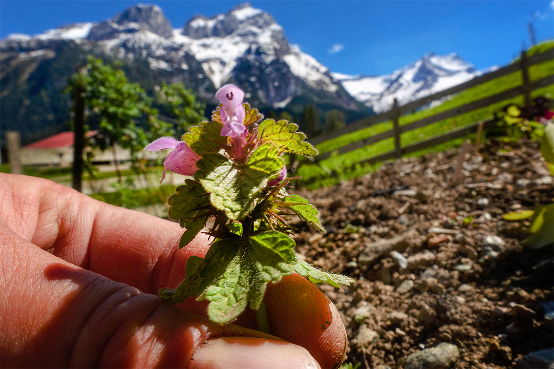 Neulich in der Grubenberghütte hatten wir die Petersilie zu kaufen vergessen. Hüttenwart Ruedi Hählen wollte schon gefriergetrockneten Schnittlauch über das Essen streuen, da sagte ich, warte kurz, ich finde dir was Besseres. Um die Hütte herum fand ich blühende Taubnesseln, die sind essbar und sehen auch hübscher aus als Petersilie. Ich habe für das Hauptmenu ganze Büschelchen verwendet, sowie einzelne Blütchen abgezupft und übers Dessert gestreut. Damit sie nicht so einsam aussehen, habe ich noch einige Löwenzahnblüten mitgenommen. Bei diesen zupft man sorgfältig die einzelnen gelben Blütenfäden ab und streut sie über Salate oder Desserts.