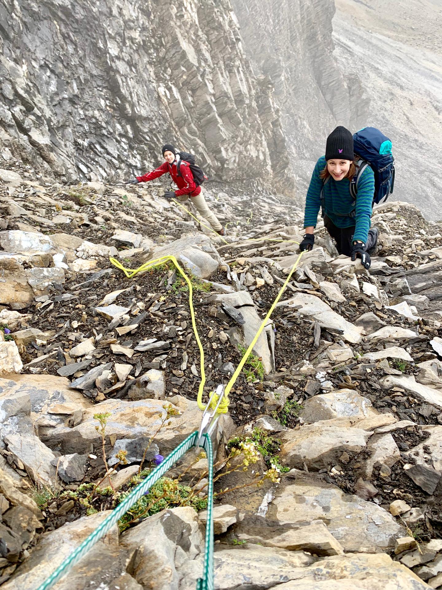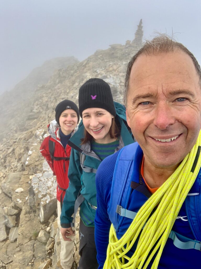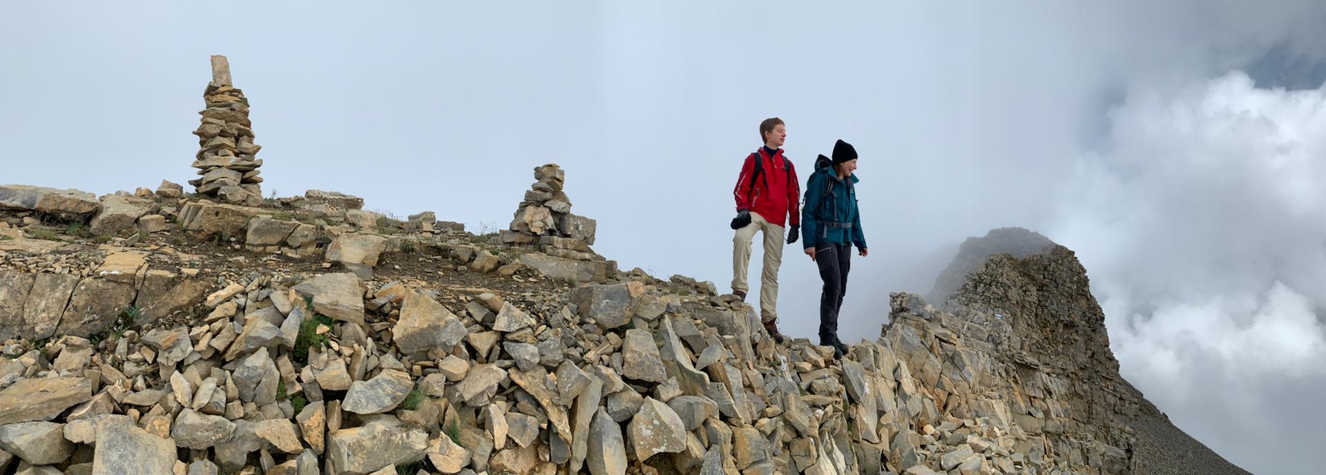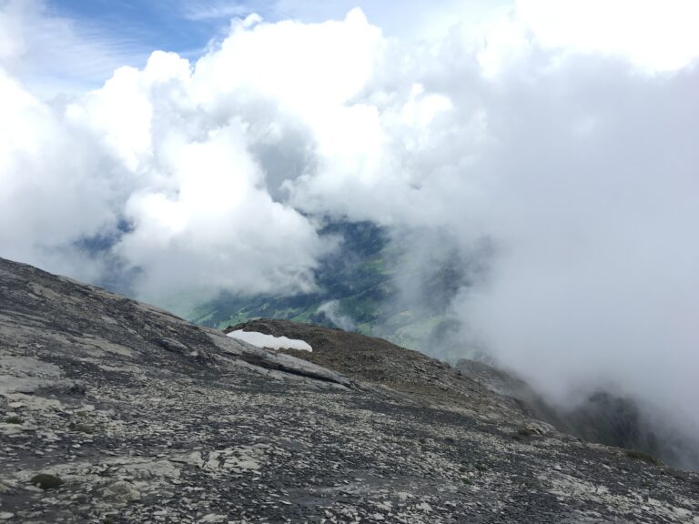 Je weiter wir in die Geröllhalden hinaufkrakselten, desto alpiner wurde die Flora, immer kleiner wurden die Glockenblumen, dicht an den Fels geschmiegt blühten die Steinbrecharten und der Mannschild. Bald tauchten wir in die Nebelwolke ein, und nun waren unsere Augen nur noch auf die Felsbrocken gerichtet. In dem weissen wattigen Nichts um uns herum fokussierte sich sozusagen der Blick. Die Blumen leuchteten nun viel intensiver, und auch die Steine schienen wie lebendig. Wie wir gegen den Grat zu kletterten, das hatte etwas Magisches, so aus dem Fels heraus in das weisse Nichts hinauszuwandeln. Einen kurzen Moment lang rissen die Wolken auf und gaben gerade kurz den Blick auf den Lauenensee frei, dann war der Vorhang wieder zu. Zum Glück waren wir alle drei mit ordentlich warmer Tourenkleidung ausgerüstet, und so liessen wir es uns dann auch nicht nehmen, auf dem Gipfel einen feinen Prosecco zu trinken (danke Ruedi!).