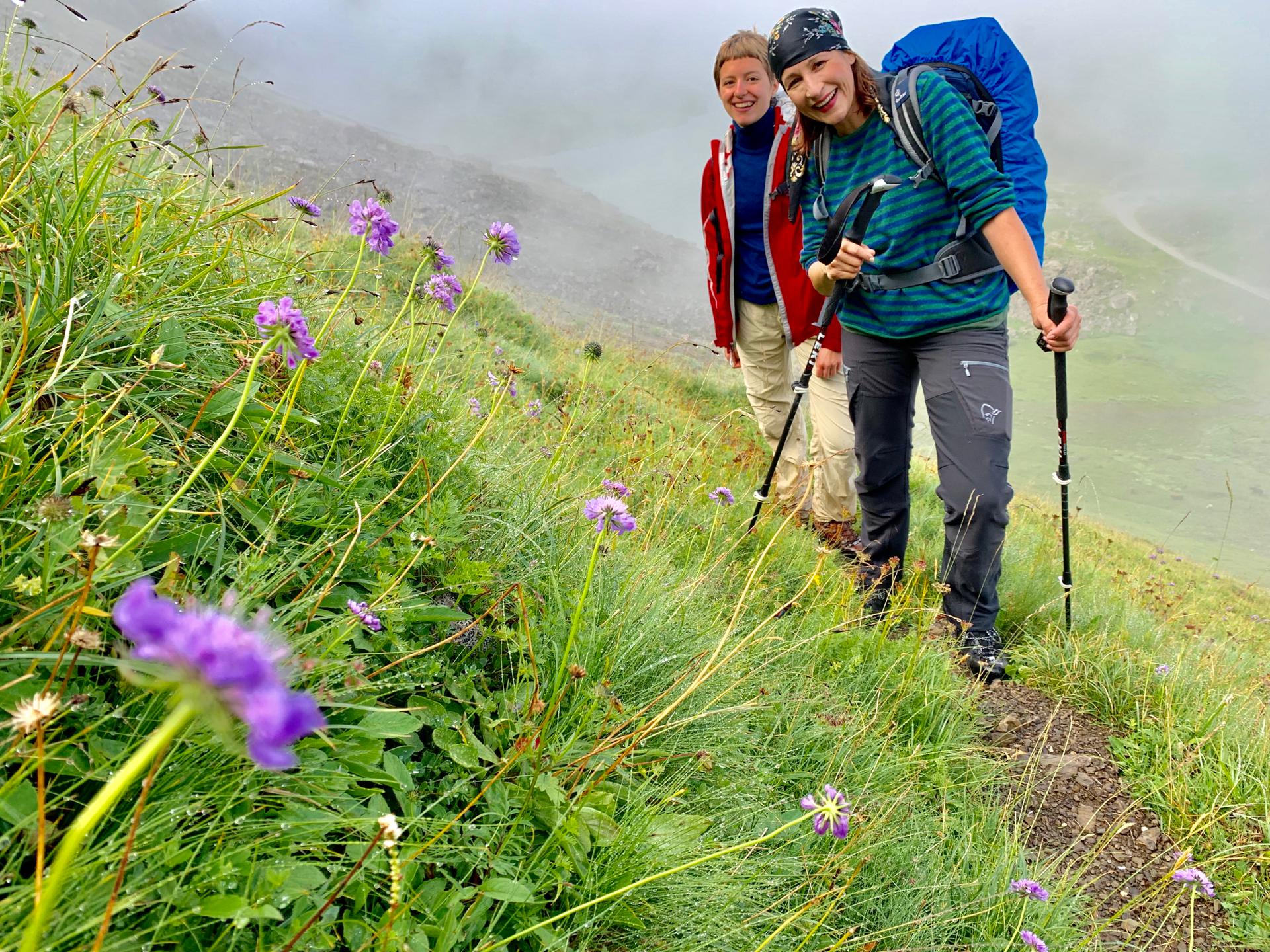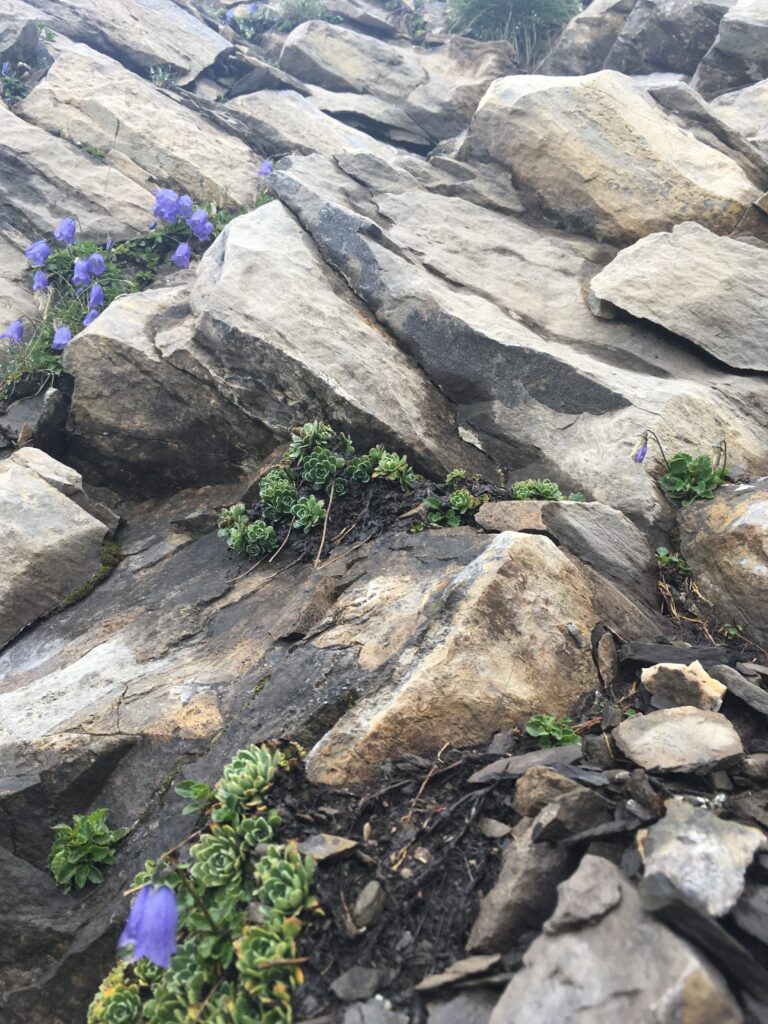 Mit mir unterwegs waren Sara Trailovic und Ruedi Hählen. Es war wie immer mit den beiden eine vergnügliche, sehr muntere und interessante Tour. Was uns vor allem aufgefallen ist: die vielen Blumen! Bis weit hinauf fanden wir Steinbrech und Mannschild, aber auch kleine Glockenblumen. Von diesen wuchsen noch zuoberst am Grat welche, an Stellen, wo wir von blossem Auge im Geröll keinerlei Humus sehen konnten. Weiter unten, gegen den Sanetschsee zu, waren die Wiesen üppig bewachsen mit Skabiosen und Gänswurz. Sogar wilden Schnittlauch fanden wir!