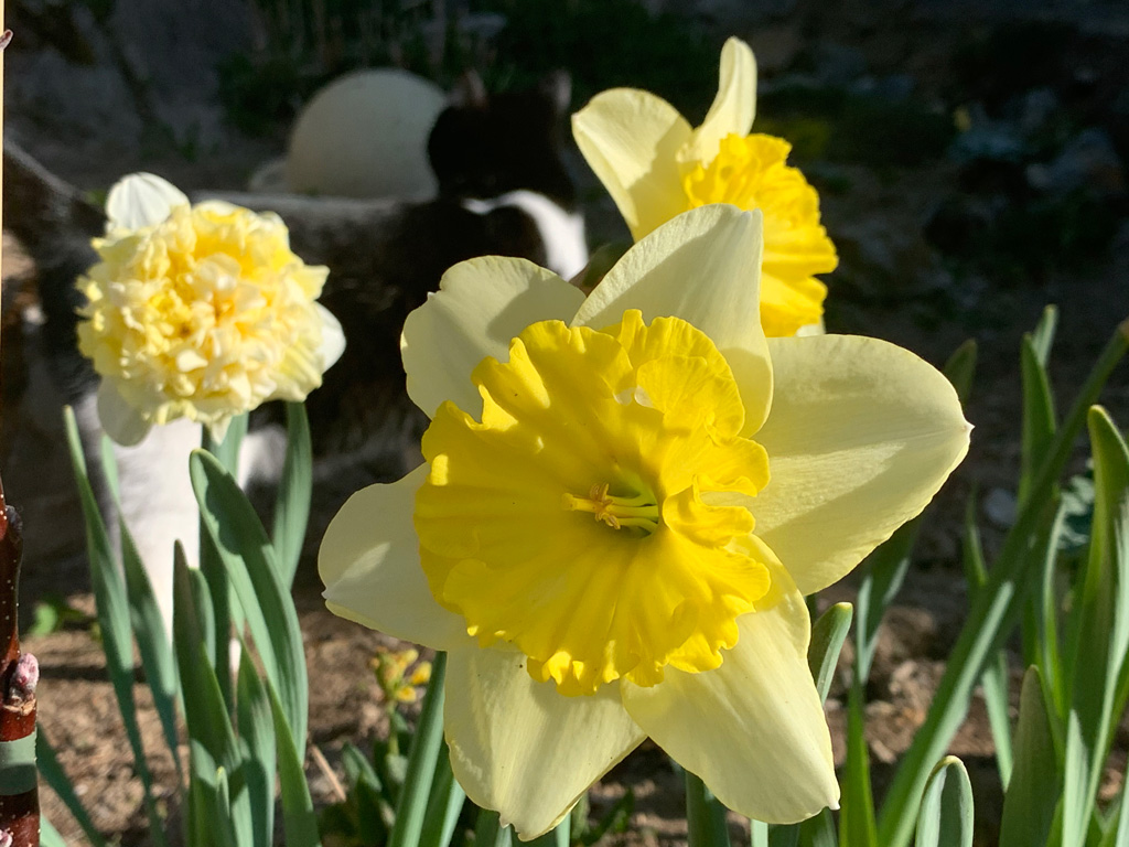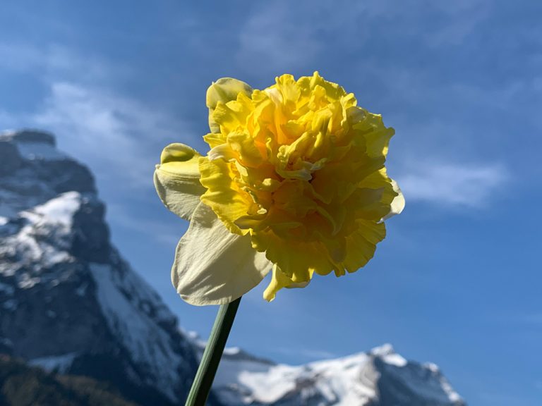Bei uns im Berner Oberland blühen sie jetzt in voller Pracht – ganze Felder voller wilder Narzissen erfreuen das Auge. Und auch im Garten zeigen sich nun die verschiedenen Sorten, von den ganz kleinen Reifrocknarzissen (Narcissus bulbocodium) bis zu den grossen Trompeten und gefüllten Sorten. Besonders gerne mag ich auch die zerzausten ‘Rip van Winkle’ mit ihrer Corona-Frisur – jede einzelne ihrer Blüten wirkt, als müsste sie nun aber dringend mal zum Coiffeur!