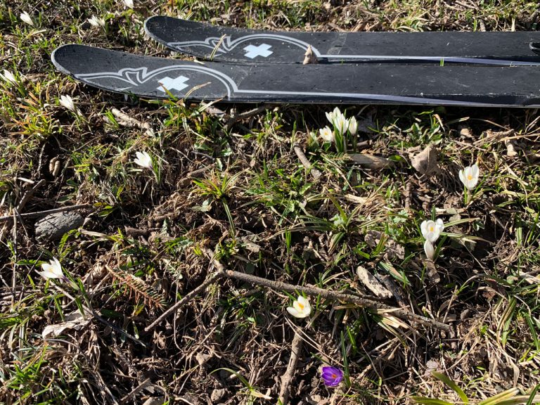 Heuer duftet der Seidelbast so intensiv in der Frühlingssonne wie noch nie. Vielleicht nehme ich ihn einfach bewusster wahr, weil meine Sinne sich auf Alarmstufe Rot eingestellt haben. Die Wahrnehmung ist in einem hyperaktiven Bereich, das kleinste Detail bekommt immense Bedeutung, als wären wir alle auf Drogen. Und so nehmen wir nun auch das Parfüm der kleinen Blüten am Wegesrand anders wahr, bewundern wir jedes einzelne Elfenkrokus wie ein noch nie dagewesenes Mirakel. Das grösste Wunder aber, und das hatte in dem Moment für mich schon fast biblische Ausmasse – es war ein bisschen wie die Taube mit dem Olivenzweig, die zur Arche Noah geflogen kam – jedenfalls, dieser Tage, wo man ja nicht mehr so genau weiss, ob man überhaupt noch raus an die frische Luft darf oder nicht, bin ich mutterseelenallein aufs Walighürli gefellt. Sass dort oben und betrachtete die Landschaft, so ganz für mich allein. Wie still alles war, wie friedlich der laue Schnee in der Frühlingssonne! Wie ich da so sass und sinnierte, landete ein Fuchsschwanz auf meinem linken Skischuh. Ich war zutiefst gerührt, ja fast erschüttert. Dass da noch ein anderes Lebewesen auftauchte, sich gar in meine Nähe getraute! Nichts von zwei Meter Abstand, nein, der Schmetterling sass minutenlang auf meinem Skischuh. Er wippte mit seinen rotschwarzen Flügeln, als wolle er mir zuwinken. Diese unerwartete Nähe, sein zutrauliches Flügelwinken, es war ergreifend. Und das sagt jetzt nicht so viel über den Schmetterling aus, hingegen einiges über meine derzeitige Gemütsverfassung. Nun gut, irgendwann ist er weitergeflogen. Und ich bin dann gemütlich durch den samtigen Sulzschnee gekurvt, habe beim Bänklein, wo ich im Frühling jeweils meine Turnschuhe deponiere, die Skischuhe ausgezogen und mich zu Fuss auf den Heimweg gemacht. Irgendwie war die Welt nun aber eine andere. Der Weg war jetzt gespickt mit Blumen, die ich beim Aufstieg gar noch nicht gesehen hatte. Da war der Seidelbast, von dem ich jetzt plötzlich Dutzende sah, nicht nur einzelne Zweige. Über viele Meter war der Weg von seinen duftenden Blüten gesäumt. In der Mitte des Weges hatten sich leuchtend gelbe Huflattich-Blüten geöffnet, die beim Aufstieg ganz sicher auch noch nicht dort gewesen waren. Weiter unten stapfte ich mit meiner Tourenausrüstung durch eine Wiese voller Elfenkrokusse. Ich legte meine Skier in die Wiese, und stellte mir vor, die Blüten wären Schnee.