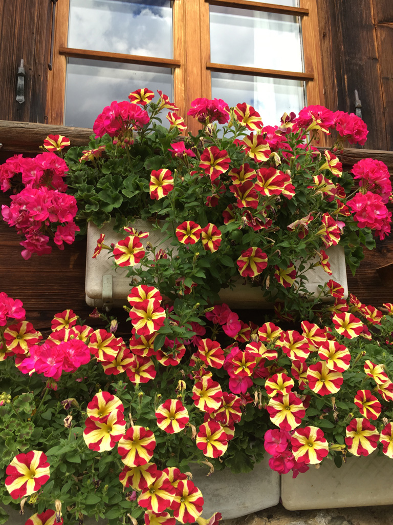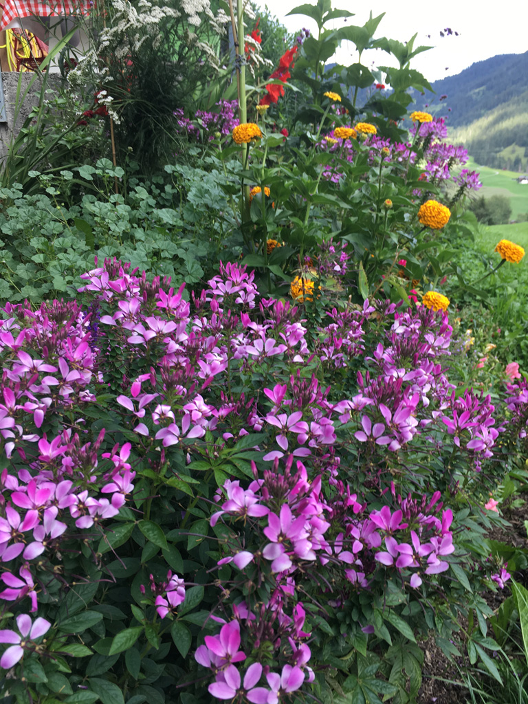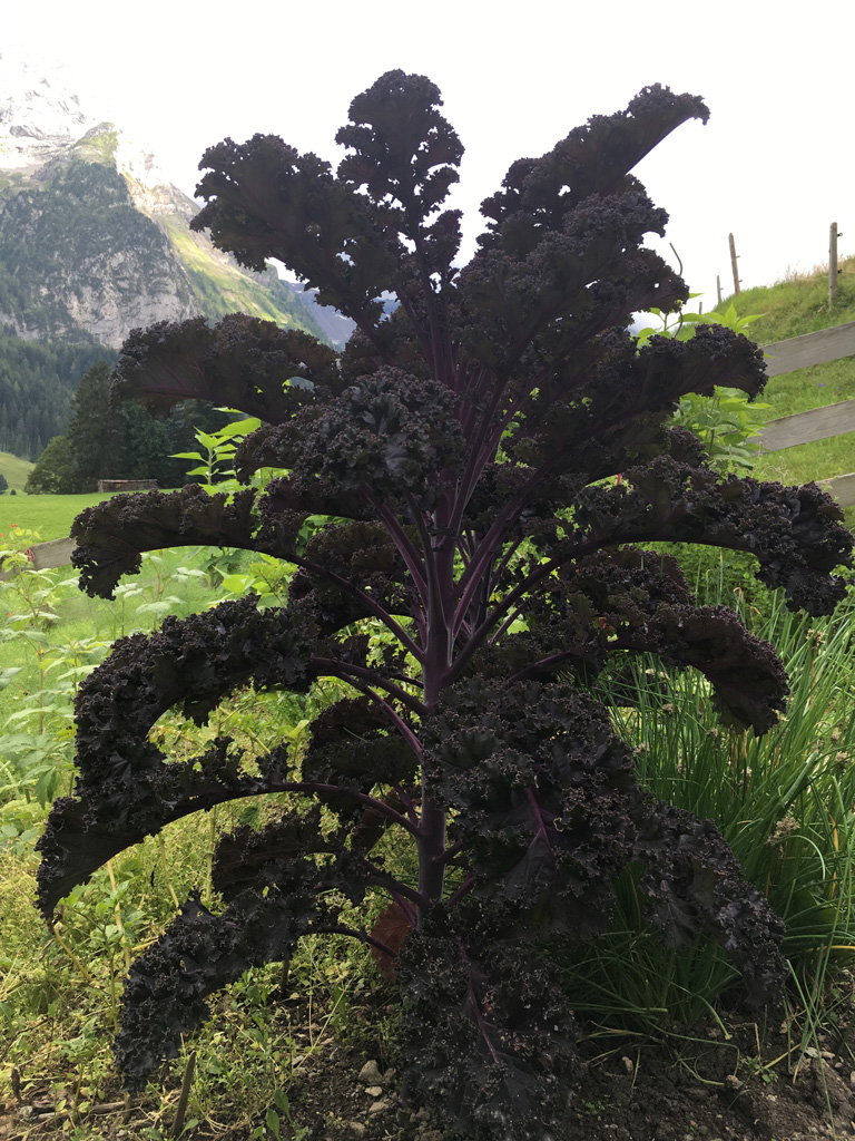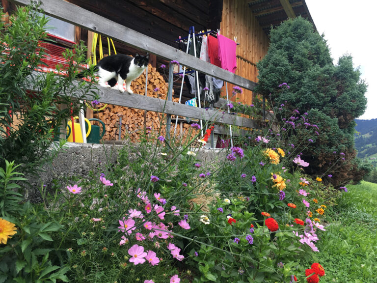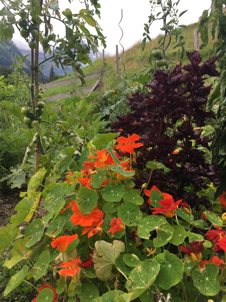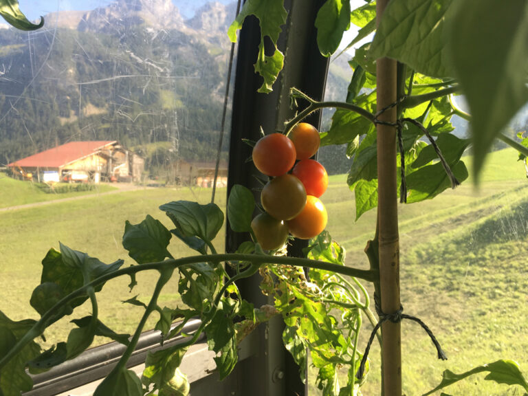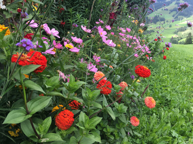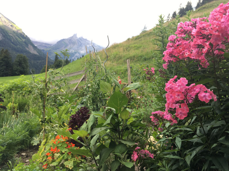 Im August quillt das Berggärtchen über in Fülle – wir ernten Gemüse nach Lust und Laune: Nebst Kräutern und Salaten haben wir Kartoffeln, Karotten, Krautstiele, Randen, Fenchel, Erbsen und vieles mehr. Der rote Federkohl gedeiht prächtig, ebenso die Stangenbohnen. Es ist eine Freude für die Küche und fürs Auge. Und die Blumen sind schöner denn je: Pelargonien und Petunien am Haus, und im Blumenbeet der Phlox, die Kosmeen, die Zinnien, die Spinnenblumen…. sogar die Tomaten reifen nun. Draussen die russischen Sorten machen sich langsam, und auch im Gondeli werden die Tomaten nun reif. Es ist eine Freude!