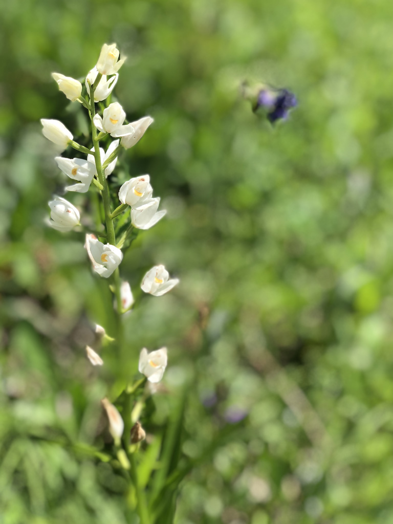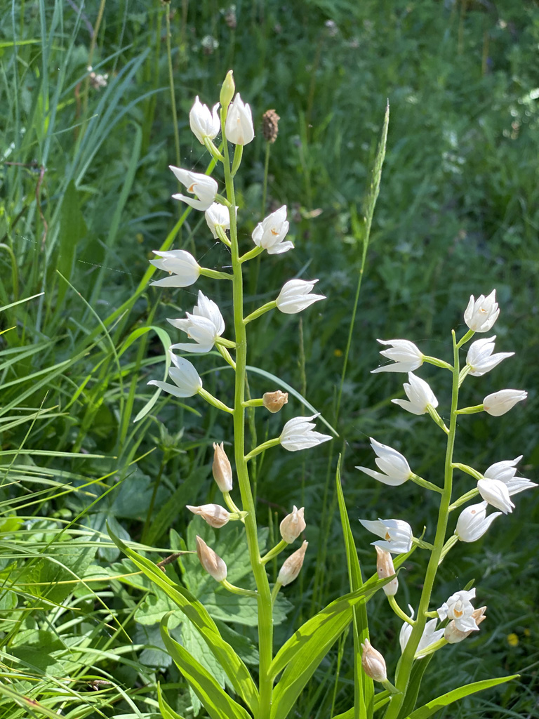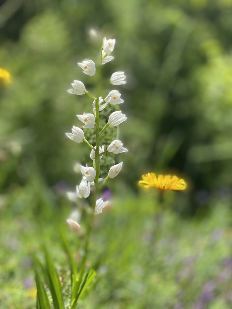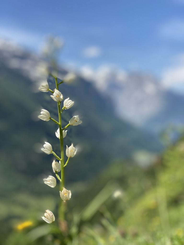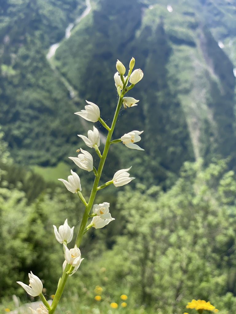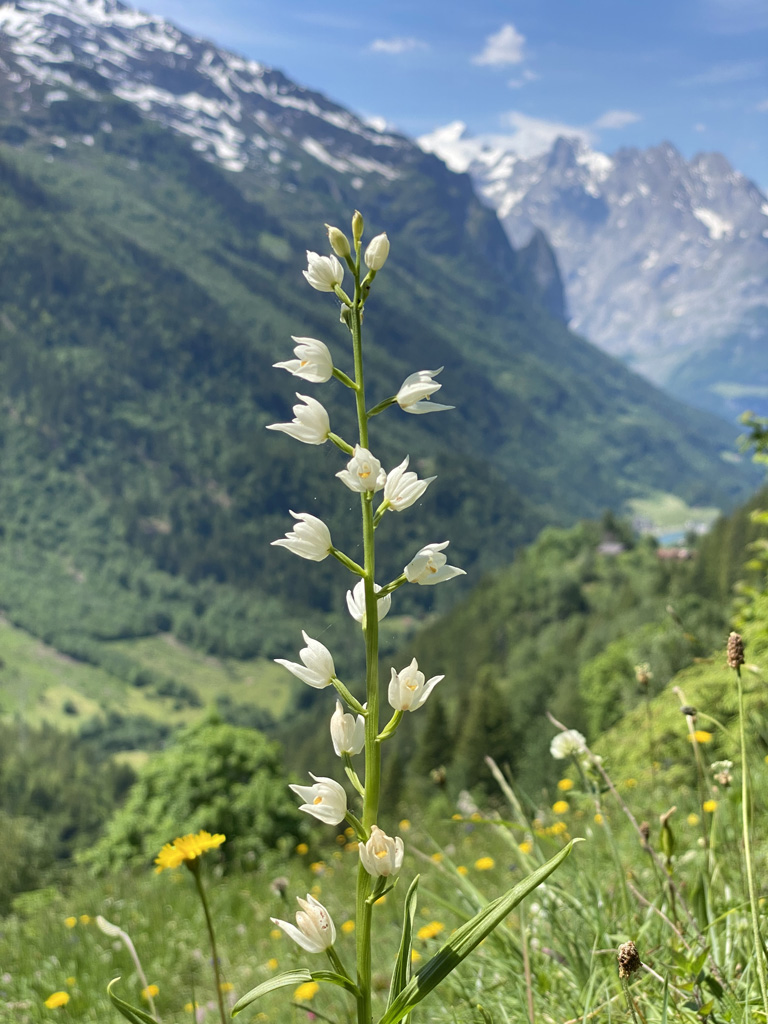 Neulich auf einer Bergwanderung im Bernischen Gadmental trauten wir unseren Augen kaum. Nichtsahnend streiften wir durch den Birchlauiwald Richtung Tällihütte hinauf, als plötzlich vor uns in einer Waldlichtung die Weissen Waldvögelein (Cephalanthera damasonium) standen. Nicht zwei, drei Stück – nein ganz viele. Zu Dutzenden wuchsen die recht seltenen Orchideen auf diesem Fleckchen Wiese. Wir knieten uns hin, und alsbald lagen wir ihnen sprichwörtlich zu Füssen, um sie von unten fotografieren zu können, mit dem Triftgletscher im Hintergrund. Was für ein prächtiger Ort, was für eine Aussicht diese Waldvögelein sich hier ausgesucht hatten!